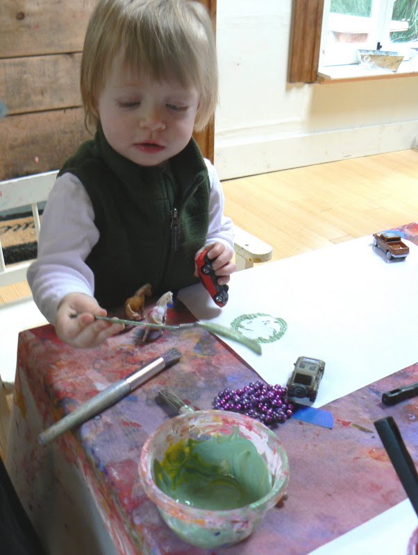 I initially offered the children bowls of paint and spoons to begin their work, while some of them had already begun taking materials off the shelf to use with their paint.